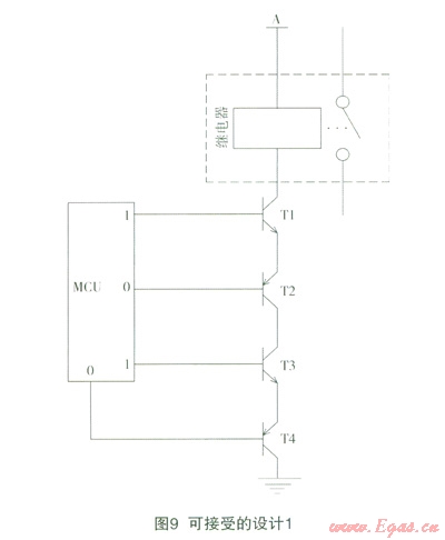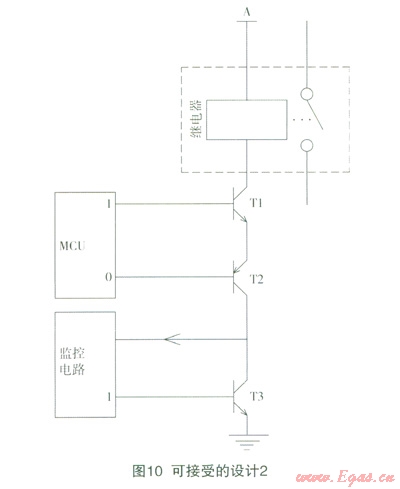 圖9、圖10的電路是可接受的設(shè)計(jì),其中圖9的電路設(shè)計(jì)可以避免任意兩個(gè)元件失效引起的繼電器不受控的問(wèn)題;圖10的電路設(shè)計(jì)采用了獨(dú)立的監(jiān)控電路沒(méi)計(jì),同樣可以解決任:卷兩個(gè)元件失效引起的繼電器不受控的問(wèn)題;監(jiān)控電路設(shè)計(jì)應(yīng)獨(dú)立于被監(jiān)控的電路,可以監(jiān)控繼電器的驅(qū)動(dòng)電路,也可以監(jiān)控繼電器的輸出。