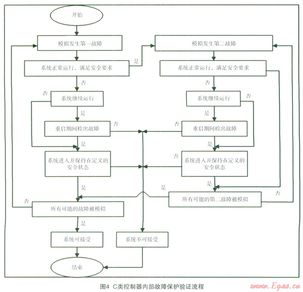 實(shí)際上,C類(lèi)控制器的電路要求是基于電子器件的失效模式及影響提出的,具有C類(lèi)安全的控制器設(shè)計(jì)應(yīng)保證在第1和第2個(gè)獨(dú)立內(nèi)部故障情況下,控制器應(yīng)保持在規(guī)定的安全狀態(tài)或進(jìn)行處理到規(guī)定的安全狀態(tài),第3個(gè)獨(dú)立故障不予考慮。這是評(píng)估或驗(yàn)證設(shè)計(jì)是否符合C類(lèi)安全要求的要點(diǎn)。故障導(dǎo)入的驗(yàn)證流程如圖4所示。
