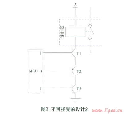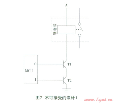 但對(duì)驅(qū)動(dòng)繼電器的電子電路則要滿足在第一、第二故障的條件下,系統(tǒng)處于安全狀態(tài)。以下圖7、圖8為不可接受的驅(qū)動(dòng)電路,圖7中T1 T2同時(shí)短路時(shí),繼電器不受控。圖8中雖然避免了任意兩個(gè)三極管失效的問(wèn)題,但當(dāng)T2短路及MCU同時(shí)失效時(shí),繼電器仍然不受控(MCU失效模式僅考慮同時(shí)輸出1或0)。