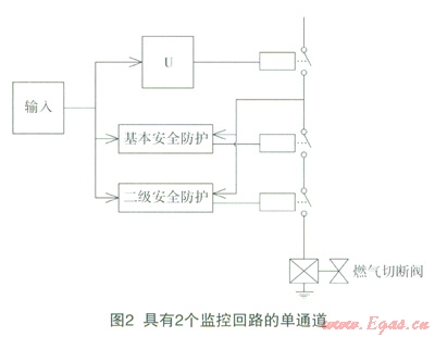 圖1中,U控制通道可以是MCU及其輸入輸出電路組成,具有完整的控制功能。這里所說(shuō)的初級(jí)安全保護(hù)是指MCU周期性的自檢,包括RAM、ROM、指令譯碼與執(zhí)行尋址與數(shù)據(jù)路徑、程序計(jì)數(shù)器(Program Counter)、輸入輸出等內(nèi)部故障的測(cè)試;第二級(jí)安全保護(hù)是失效監(jiān)控電路,是獨(dú)立于以上通道的,可以根據(jù)輸入的狀態(tài)來(lái)判定控制通道U的輸出是否正常,當(dāng)控制通道U的控制功能失效后,監(jiān)控電路可以保證燃?xì)忾y的切斷功能受控,監(jiān)控電路的輸出控制應(yīng)是獨(dú)立的執(zhí)行機(jī)構(gòu)(如繼電器)。監(jiān)控電路可以是MCU構(gòu)成控制電路,也可以是一般電子器件構(gòu)成的回路。
