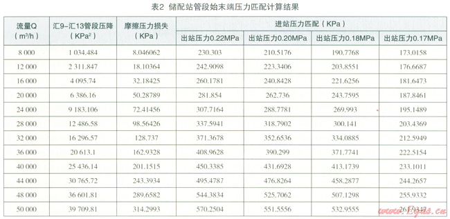 通過(guò)計(jì)算得到儲(chǔ)配站在不同流量下進(jìn)、出站壓力匹配計(jì)算結(jié)果見(jiàn)表2。