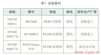 為了驗(yàn)證不同等級及有無炭黑聚乙烯燃?xì)夤懿牡奈潭取雍嘎辄c(diǎn)出現(xiàn)程度及其影響大小,該試驗(yàn)分別選取了中密度聚乙烯原材料ME3440(含炭黑)、高密度聚乙烯原材料HE3490LS(含炭黑)及橙色高密度聚乙烯原材料XSl0 Orange YCF(不含炭黑)生產(chǎn)出的管材(詳見表1);為保證水份充分滲透,將管材浸泡在常溫水中,浸泡時間為2年。