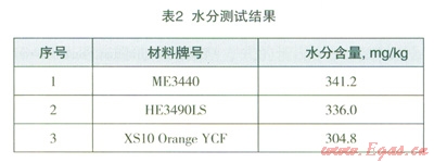 測試結(jié)果表明:3種材料聚乙烯燃?xì)夤懿木哂形?,并且水分含量相差不大,均大?span lang="EN-US">300mg/kg。