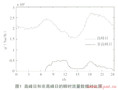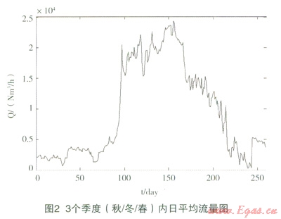 圖1表示:用氣高峰日和非高峰日內(nèi)下游用戶(hù)一天內(nèi)用氣量隨時(shí)間的變化過(guò)程;圖2表示:一年內(nèi)260天的日平均用氣量。從圖1和圖2中可以看出:高峰日和非高峰日,高峰時(shí)段和非高峰時(shí)段時(shí),天然氣的流量變化范圍很大,在考慮性?xún)r(jià)比的情況下,實(shí)際流量計(jì)的選擇必須覆蓋流量上限。由此可能會(huì)出現(xiàn):在用氣量低谷時(shí),實(shí)際運(yùn)行流量接近或低于流量計(jì)下限,從而引起流量的測(cè)量不準(zhǔn)確。