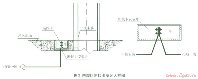 屋面避雷帶及接閃短桿均與建筑物鋼筋混凝土立柱內(nèi)主筋相焊接,鋼筋混凝土立柱內(nèi)(兩根不少于Æ16)主鋼筋做引下線(引下線采用綁扎連接),與接地網(wǎng)作可靠電氣連接。作引下線的立柱應(yīng)沿建筑物四周均勻布置,間距不得大于18m。很多設(shè)計員存距地面0.3m~0.5m的立柱上設(shè)斷接卡與站內(nèi)的人工接地網(wǎng)相連接,但壓縮機間、工藝罩棚立柱周圍都處于防爆區(qū),在防爆區(qū)內(nèi)直接設(shè)置斷接卡存在很大的安全隱患,所以防爆區(qū)內(nèi)引下線斷接卡應(yīng)采用防爆接線盒安裝,并用防爆膠泥密封,或者是設(shè)置在地面上,用干沙填實。尤其是LNG場站更需注意,因為LNG泄漏后迅速氣化而形成的低溫氣體比重較大,會聚集在地面附近,遇到斷接卡放電時極易發(fā)生爆炸。