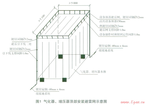 根據(jù)《建筑物防雷設(shè)計規(guī)范》GB50057—2010規(guī)定,加氣站、門站、調(diào)壓站內(nèi)的工藝罩棚、壓縮機間等工藝構(gòu)筑物均屬于2類防雷建筑物,站內(nèi)的站房、輔房屬于3類防雷建筑物。在壓縮機間犀面上用中12熱鍍鋅圓鋼敷設(shè)不大于10m×10m或12m×8m的避雷網(wǎng)格,四角做接閃短桿。工藝罩棚一般為雙層彩鋼板屋面,中間為阻燃物,很多設(shè)計員認為即使罩棚遭受雷擊,只要彩鋼板厚度大于0.5mm,閃電只會擊壞罩棚而不會危及罩棚下的工藝裝置和人員的安全,所以直接利用罩棚作接閃器。但這種思路卻忽略了對罩棚本身的防護,罩棚頂部被擊壞后維修比較困難,并且罩棚被擊壞后雨水滲入會對罩棚的鋼結(jié)構(gòu)造成腐蝕,縮短罩棚的使用壽命。所以在罩棚頂部也應(yīng)用F12熱鍍鋅圓鋼布置成不大于10m×10m或12m×8m的避雷網(wǎng)格,并在四角做接閃短桿。