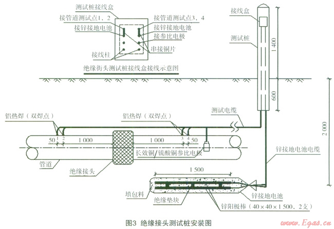工藝專業(yè)一般都在加氣站、門站、調(diào)壓站等場站的進出站管道上設(shè)有絕緣接頭。絕緣接頭的功能主要有兩個,一是將陰極保護電流限制在站外管道上,防止陰極保護電流通過站內(nèi)工藝裝置的接地系統(tǒng)流失,二是將站內(nèi)設(shè)備的雜散電流隔絕在站內(nèi),防止雜散電流流到站外長輸管道或者城市管網(wǎng)上造成雜散電流干擾腐蝕。但絕緣接頭只能作為隔絕管道陰極保護電流及站內(nèi)雜散電流用,而不能作為過電壓的安全防護措施用,站內(nèi)及管道上因雷擊產(chǎn)生的高電壓、站內(nèi)設(shè)備故障產(chǎn)生的高電壓、管道上因氣流摩擦而產(chǎn)生的靜電、長輸管道的感應(yīng)過電壓等都會將絕緣接頭損壞。絕緣接頭一旦損壞就會對長輸管道或者城市管網(wǎng)的陰極保護系統(tǒng)造成嚴重影響,甚至使陰極保護系統(tǒng)失效,所以必須為絕緣接頭添加防護措施。絕緣接頭的防護裝置主要有避雷器、電解接地電池、極化電池及二極管保護器,目前應(yīng)用最廣泛的是接地電池。接地電池是用來提供一個低電阻通道,排放強電電涌但不泄漏陰極保護直流電流的一種裝置,通常采用鋅材料制作[1]。