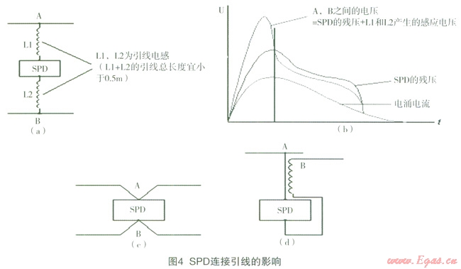在各級配電柜/箱及信息系統(tǒng)線路上安裝相應(yīng)級別的電涌保護器(SPD),以把雷電流及電氣系統(tǒng)故障電流盡可能地泄入大地,保護用電設(shè)備的安全。為使SPD安裝處呈現(xiàn)的最大電涌電壓足夠低,SPD兩端的引線應(yīng)做到最短(兩端引線總長度不宜大于0.5m),并且要避免形成過大環(huán)路,以獲得最佳保護效果。當引線較長而產(chǎn)生的引線寄生感應(yīng)電壓較大時,可采用圖4中(c)、(d)的接線,以轉(zhuǎn)移和補償引線的寄生電感,從而改善保護電路的性能[2]。