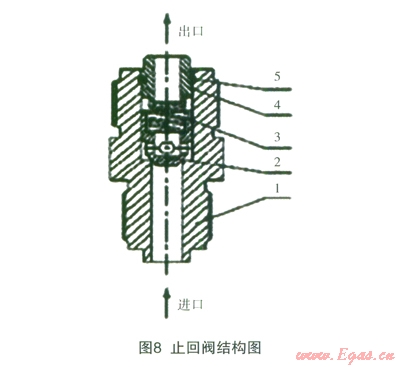 止回閥由閥體①、錐閥芯②、彈簧③、彈簧座③和擋圈⑤構(gòu)成(見(jiàn)圖8)。其工作原理是壓縮氣體進(jìn)入閥體,克服彈簧的彈簧力和摩擦力使止回閥開(kāi)啟,壓縮氣體從進(jìn)口流入從出口流出,當(dāng)出口無(wú)壓縮氣體時(shí),在彈簧力和進(jìn)口(腔)余力作用下,閥口處于關(guān)閉狀態(tài),使從進(jìn)口到出口的氣體不流通。適用于只允許氣體向一個(gè)方向流動(dòng),即從進(jìn)口流入從出口流出,反過(guò)來(lái)則不可以。