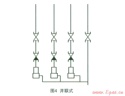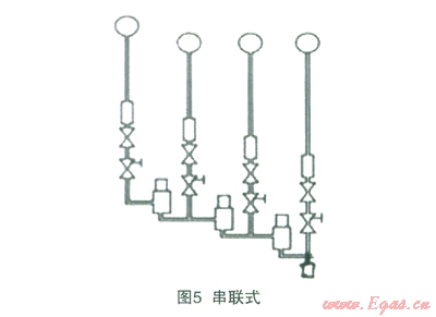 目前國(guó)產(chǎn)的優(yōu)先順序控制盤分為并聯(lián)式(見(jiàn)圖4)和串聯(lián)式(見(jiàn)圖5)兩種,均設(shè)高、中、低壓和直充功能,其核心部件也就是壓力保持閥和止回閥。串并聯(lián)的優(yōu)先順序控制盤均經(jīng)過(guò)壓力保持閥和止回閥改造實(shí)現(xiàn)儲(chǔ)氣井的天然氣回收。其不同的是,并聯(lián)式優(yōu)先順序控制盤在回收儲(chǔ)氣井(瓶)中的天然氣時(shí)可以對(duì)高、中和低壓其中之一進(jìn)行回收,互不影響,操作簡(jiǎn)單、方便;而串聯(lián)式則在回收任何一個(gè)儲(chǔ)氣井(瓶)時(shí)要對(duì)高、中和低壓三組壓力保持閥和止回閥同時(shí)進(jìn)行改造,相對(duì)就麻煩一些。