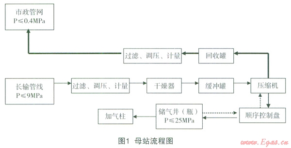 母站接收的天然氣,經(jīng)過(guò)加工,一部分加注燃?xì)廛囕v,一部分進(jìn)入市政管網(wǎng),形成了兩個(gè)供氣路徑。其中,儲(chǔ)氣井的氣可以通過(guò)順序控制盤、壓縮機(jī),經(jīng)過(guò)過(guò)濾、調(diào)壓、計(jì)量,進(jìn)入市政管網(wǎng)(見(jiàn)圖l)。