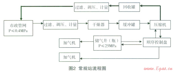 接通市政管網(wǎng)是常規(guī)加氣站一個(gè)顯著的特征。儲(chǔ)氣井(瓶)中的天然氣回收從儲(chǔ)氣井(瓶)開(kāi)始,流經(jīng)順序控制盤、壓縮機(jī)到回收罐,最后經(jīng)過(guò)過(guò)濾、調(diào)壓、計(jì)量進(jìn)入市政管網(wǎng),形成了一個(gè)供氣回路(見(jiàn)圖2)。