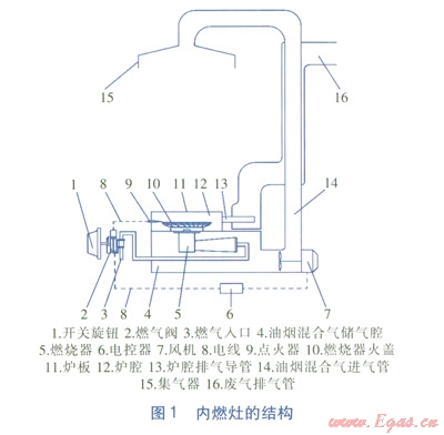 內(nèi)燃灶的結(jié)構(gòu)見圖l。工作時(shí),空氣連同炊事產(chǎn)生的油煙、水蒸氣通過風(fēng)機(jī)壓送到封閉的爐腔內(nèi),燃?xì)庠谧陨韷毫ψ饔孟逻M(jìn)入燃燒器,并在高于大氣壓的條件下燃燒,加熱爐板,爐板可直接加熱食物或其他烹飪炊具;高溫廢氣在排出的過程中加熱油煙混合氣進(jìn)氣管內(nèi)的氣體,減少?gòu)U氣余熱的浪費(fèi),提高系統(tǒng)熱效率[5]。
