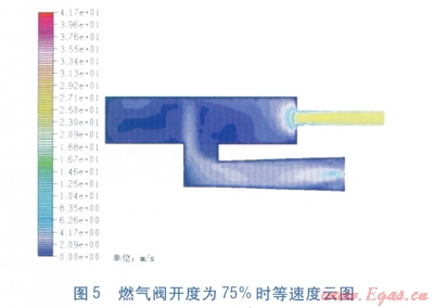 利用FLUENT軟件對(duì)比模擬了燃?xì)忾y開度為25%和75%兩種條件下爐腔內(nèi)的氣體流動(dòng)狀態(tài)。計(jì)算得出兩種狀態(tài)下整個(gè)爐腔內(nèi)氣流的最高流速分別為24.61m/s和46.86m/s。高速流主要出現(xiàn)在爐腔排氣導(dǎo)管。