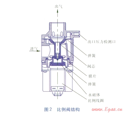 比例閥還具有穩(wěn)定燃?xì)鈮毫ψ饔?,?dāng)作用在壓力調(diào)節(jié)器膜片上的燃?xì)鈮毫υ龃髸r(shí),膜片帶動(dòng)閥芯向下運(yùn)動(dòng)減小相對(duì)開度,保證出口壓力的穩(wěn)定;反之,當(dāng)作用在壓力調(diào)節(jié)器膜片上的燃?xì)鈮毫p小時(shí),膜片帶動(dòng)閥芯向上運(yùn)動(dòng)增大相對(duì)開度,保證出口壓力的穩(wěn)定。
