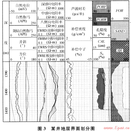 根據(jù)前面得知界面處電阻率極大值位置偏向高阻層的內(nèi)部,通過對(duì)實(shí)際測(cè)井資料分析發(fā)現(xiàn)一般界面離“極化角,,距離為0.5~1m,再結(jié)合其他的測(cè)井曲線一般可以正確劃分出儲(chǔ)層界面。