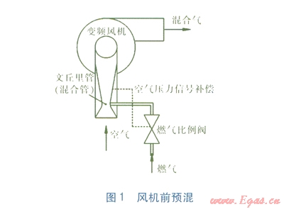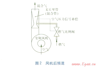 目前市場上的全預(yù)混冷凝式燃氣壁掛爐(以下簡稱全預(yù)混壁掛爐)主要有風機前預(yù)混、風機后預(yù)混兩種,分別見圖l、2。變頻風機、燃氣比例閥[2-3]提供燃燒所需的空氣與燃氣,空氣與燃氣按設(shè)定好的空燃比進行混合燃燒。