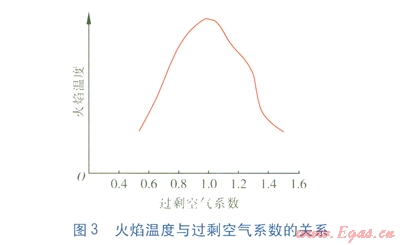 要實現(xiàn)穩(wěn)定的全預(yù)混燃燒,關(guān)鍵在于保持合理、穩(wěn)定的空燃比。實驗證明,全預(yù)混燃燒空燃比過大或者過小都會對燃燒造成不利影響??杖急冗^大時,多余空氣會帶走熱量,火焰溫度降低,熱效率降低;空燃比過小時,燃燒不充分,火焰溫度及熱效率亦降低。同理,當空燃比過大時,多余的空氣會稀釋離子;過小時,由于未能充分反應(yīng),燃燒過程未能產(chǎn)生足夠多的離子。火焰溫度與過??諝庀禂?shù)的關(guān)系見圖3。由圖3可知,當空燃比最佳時,火焰溫度達到峰值,火焰離子電流也達到峰值。這是離子電流檢測法用于判斷全預(yù)混燃燒空燃比的理論依據(jù)。