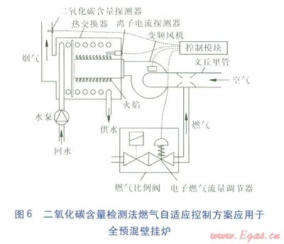 二氧化碳含量探測法燃氣自適應(yīng)控制方案應(yīng)用于全預(yù)混壁掛爐見圖6。其控制原理為:二氧化碳含量探測器對煙氣中的二氧化碳含量進行實時監(jiān)控,控制模塊接收二氧化碳含量探測器的信號,對信號進行邏輯分析。當二氧化碳含量偏離設(shè)置值時,控制模塊會迅速輸出電信號給電子燃氣流量調(diào)節(jié)器及變頻風機,進行控制參數(shù)調(diào)整,從而調(diào)整空燃比,使煙氣中的二氧化碳體積分數(shù)恢復到9%左右。需要說明的是二氧化碳含量檢測法燃氣自適應(yīng)控制方案中也要有離子電流探測器,用以判斷火焰是否存在。