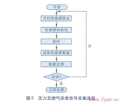 系統(tǒng)按照設(shè)定頻率,定時啟動數(shù)據(jù)采集,采集過程嚴格控制傳感器供電時間,既充分考慮了低功耗需求,又可以避免供電時間太短造成傳感器數(shù)據(jù)未達到穩(wěn)定水平。壓力及燃氣濃度信號采集流程見圖5。