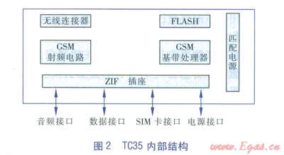 在野外閥門井監(jiān)測點和調(diào)度中心,數(shù)據(jù)的接收和發(fā)送采用GSM模塊TC35,它具有語音呼叫、數(shù)據(jù)呼叫、短消息等多種功能,本系統(tǒng)主要采用GSM模塊TC35的短消息接收和發(fā)送功能,模塊內(nèi)部結(jié)構(gòu)見圖2。