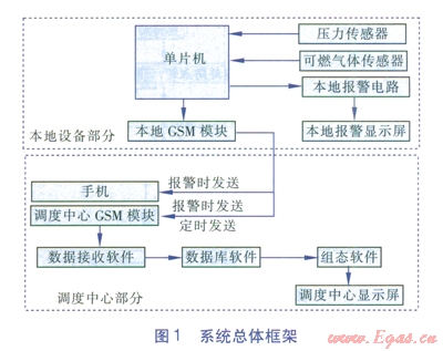 該系統(tǒng)主要由l2部分組成,包括手機、本地GSM模塊、調(diào)度中心GSM模塊、單片機、壓力傳感器、可燃氣體傳感器、本地報警電路、本地報警顯示屏、調(diào)度中心的數(shù)據(jù)接收軟件、數(shù)據(jù)庫軟件、組態(tài)軟件、顯示屏。系統(tǒng)總體框架見圖l。