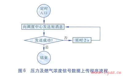 系統(tǒng)會將定時采集到的壓力及燃氣濃度信號數(shù)據(jù),以短信形式定時向調(diào)度中心接收端GSM模塊發(fā)送,詳見圖6。