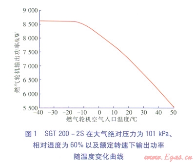 溫度升高、濕度增大固然會降低燃?xì)廨啓C(jī)的輸出功率,但是根據(jù)SGT200-2S燃?xì)廨啓C(jī)性能曲線,其設(shè)計(jì)功率能夠滿足當(dāng)?shù)馗鱾€(gè)溫度下制冷劑壓縮機(jī)的功耗要求。SGT200-2S在大氣絕對壓力為l01kPa、相對濕度為60%的設(shè)定狀況以及額定轉(zhuǎn)速下輸出功率隨溫度的變化曲線見圖l。從圖1中可以看出,即使在40℃下理論上燃?xì)廨啓C(jī)輸出功率仍能滿足制冷劑壓縮機(jī)的功耗要求。該廠所處地區(qū)夏季平均環(huán)境溫度為32.7℃,低于40℃;該地區(qū)夏季相對濕度為80%,高于燃?xì)廨啓C(jī)設(shè)定狀況下的相對濕度,可能會造成燃?xì)廨啓C(jī)輸出功率有所降低,但影響效果應(yīng)該較小[1]。