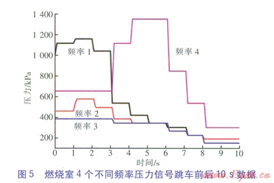 燃燒室4個(gè)不同頻率壓力信號跳車前后10s數(shù)據(jù)如圖5所示,這4個(gè)壓力信號表征燃燒室火焰振蕩特征頻段的強(qiáng)度。頻率l、頻率2、頻率3、頻率4代表頻率依次降低。從圖5可以看出,在2s左右,高頻段頻率1、頻率2的值突降,圖3和圖4中7號燃燒室的溫度也突然降低;3s左右,高頻段強(qiáng)度進(jìn)一步降低,低頻段信號頻率4突然增強(qiáng),7號燃燒室的溫度也再次下降;4s左右,這一趨勢進(jìn)一步加強(qiáng),7號燃燒室溫度也進(jìn)一步降低;6s以后,所有頻段的信號強(qiáng)度都減弱,這是因?yàn)橹?、輔燃料閥都已經(jīng)關(guān)小,燃燒室功率下降。從以上變化趨勢可以看出,火焰高頻振動減弱、低頻振動加強(qiáng)代表燃燒不穩(wěn)定的增強(qiáng),最后導(dǎo)致火焰被吹滅,燃燒室溫度下降。該廠現(xiàn)場操作人員也反映,燃?xì)廨啓C(jī)運(yùn)行過程中除了正常的運(yùn)行噪聲外,還有周期性的轟隆聲,這些外部表現(xiàn)與燃?xì)廨啓C(jī)熱聲振蕩燃燒現(xiàn)象非常相似。周期性的燃燒不穩(wěn)定,并且出現(xiàn)較大振幅的壓力波動,這種現(xiàn)象通常稱為熱聲振蕩燃燒。