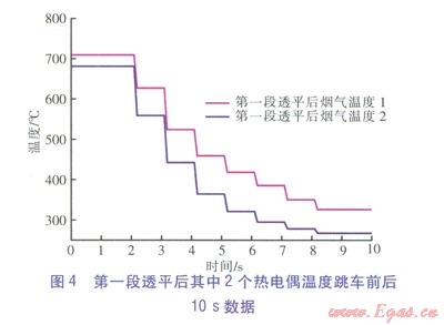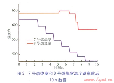 燃?xì)廨啓C(jī)第一段透平后設(shè)置了16個(gè)測溫?zé)犭娕迹渲?span lang="EN-US">2個(gè)熱電偶跳車前后l0s數(shù)據(jù)如圖4所示,根據(jù)熱電偶測點(diǎn)位置可以確定這兩個(gè)熱電偶測得的是7號燃燒室后的煙氣溫度。圖4中的數(shù)據(jù)顯示第一級透平后的溫度甚至高于圖3中燃燒室的溫度,這是因?yàn)閳D3中顯示的燃燒室溫度并不是透平進(jìn)口初溫(該溫度通常為ll00℃以上),而是實(shí)際燃燒室內(nèi)熱電偶布點(diǎn)處的溫度,由于燃燒室溫度并不是均勻的,該熱電偶所處位置溫度較低。