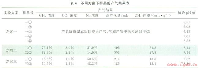 產(chǎn)氫廢料的產(chǎn)甲烷反應(yīng)啟動較慢,大約在第35天才開始有氣體產(chǎn)生,且產(chǎn)氣速率遠比產(chǎn)氫階段要慢,持續(xù)時間較長,直到第55天后才停止產(chǎn)氣。第65天測試各個集氣瓶中的氣體組分(表4)。所有樣品中均未檢測到氫氣。