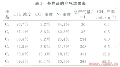 單獨發(fā)酵產(chǎn)甲烷工藝大約在第15天后才開始有甲烷產(chǎn)生,產(chǎn)氣持續(xù)時間約為30d,本實驗于第35d測試各樣品的產(chǎn)氣結(jié)果(表3)。