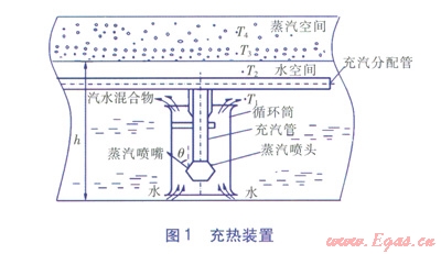 水的循環(huán)擾動由蒸汽的噴射動量和上下汽水混合物密度差聯(lián)合作用產(chǎn)生,噴嘴與豎直方向夾角(噴嘴安裝角)q角(見圖l)不影響噴射動量大小,但會影響蒸汽噴射角度。q角越大,蒸汽流橫向動量越大,水的橫向混合越充分,水空間溫度分布更趨于均勻,水平方向充熱效果越好;q角越小,蒸汽射流的豎直方向分量越大,由于蒸汽噴射引起循環(huán)擾動強度遠大于密度差引起的自然對流,因此,水循環(huán)擾動越強,整體的傳熱效果越好。因此q角對充熱過程有雙重性影響,找出二者的平衡點,是確定最佳噴嘴安裝角的關(guān)鍵。經(jīng)吳曉等[6]實驗數(shù)據(jù)驗證:當q角為30°或60°時,噴射蓄熱效果相當,充熱效率較好;而q角為45°時,噴射蓄熱效果稍差。q角最佳值隨著實驗裝置、工況條件的差別稍有不同,但可以肯定當q角約為30°或60°時,可以達到較好的充熱效果。