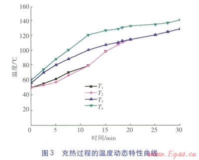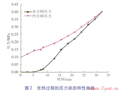 蒸汽蓄熱器是利用水的單位體積焓遠大于蒸汽的特性而設(shè)計的間接存儲蒸汽的貯熱裝置,其中的水既是蒸汽和水進行熱交換的傳熱介質(zhì),又是蓄存熱能的載熱體[1]。蒸汽蓄熱器的蓄熱(充熱)過程是鍋爐供給的高壓蒸汽直接與蒸汽壓較低的飽和水的混合傳熱過程。充熱裝置是蒸汽蓄熱器的一部分,見圖l。充熱過程中,工作蒸汽通過充汽分配管進入蒸汽噴射系統(tǒng),均勻噴射入蓄熱器水空間,使蓄熱器內(nèi)水溫、水位和焓逐漸升高。充熱過程終止時,蓄熱器內(nèi)儲存與充汽分配管等蒸汽壓的飽和水及與其相應(yīng)的焓,同時水位達到與充汽分配管底部平齊[4]。充熱過程要力求高壓蒸汽通過噴嘴盡量充分、快速、均勻地溶入到飽和水中,這要求盡量強化水循環(huán)的湍流擾動。傳質(zhì)傳熱的程度和速度直接影響飽和水空間溫度場及蒸汽壓力與水飽和蒸汽壓之間的偏差,由此造成不可逆內(nèi)部熱損失隨充熱時間的增加而增加。充熱過程動態(tài)特性曲線見圖2、3。