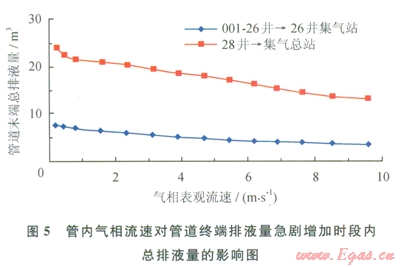 2)對(duì)管道終端總排液量的影響。清管過(guò)程中2條管道終端在排液量急劇增加時(shí)段內(nèi)的總排液量如圖5所示。由圖5可知,不同氣相流速對(duì)清管過(guò)程中管道終端排液量急劇增加時(shí)段內(nèi)總排液量的變化將產(chǎn)生顯著影響。隨著管內(nèi)氣相流速的增大,管道終端總排液量呈現(xiàn)逐漸遞減的趨勢(shì),這是由于隨著管輸量的增加,管內(nèi)氣流速度增大,氣體的攜液能力增強(qiáng),管內(nèi)總積液量減少,因而清管過(guò)程中管道終端總排液量也將減少。