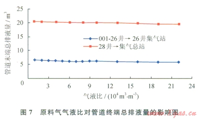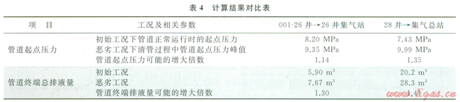 由表4與圖8、9可知,當(dāng)管內(nèi)氣相流速與氣液比均減小時(shí),清管過(guò)程中管道的起點(diǎn)壓力峰值和終端排液量均將增大,但不同管道的增大幅度并不一致,體現(xiàn)出的基本規(guī)律為:管道越長(zhǎng)或高程差越大,清管中管道的起點(diǎn)壓力峰值和終端排液量增大幅度越大。其中,對(duì)管道較長(zhǎng)高程差較大的28井®集氣總站管道而言,在管道運(yùn)行到后期可能遇到的惡劣工況下清管過(guò)程中管道起點(diǎn)壓力將比管道運(yùn)行初期正常運(yùn)行工況下的起點(diǎn)壓力增大1.35倍,而終端排液量則比管道運(yùn)行初期清管過(guò)程中的排液量增大1.41倍。