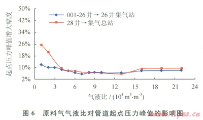 1)對(duì)管道起點(diǎn)壓力的影響。2條管道在不同原料氣氣液比下的管道起點(diǎn)壓力峰值變化情況如圖6所示。由圖6可知,原料氣氣液比也對(duì)清管過(guò)程管道起點(diǎn)壓力的變化具有重要影響,即:當(dāng)原料氣氣液比低于4×10m3/m3時(shí),清管過(guò)程中管道起點(diǎn)壓力峰值則隨原料氣氣液比的減小而快速增大,尤其當(dāng)原料氣氣液比小于1×104m3/m3后,清管過(guò)程中的管道起點(diǎn)壓力峰值將增大到正常生產(chǎn)工況下管道起點(diǎn)壓力的l.1~1.3倍。