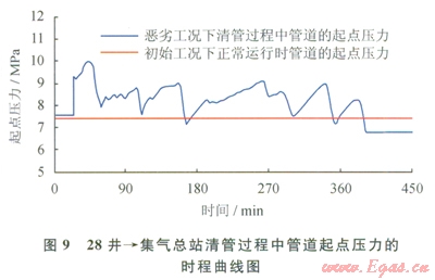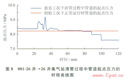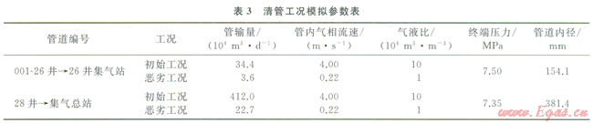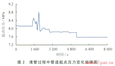 為簡(jiǎn)化起見(jiàn),僅以001-26井®26井集氣站氣液混輸管道實(shí)際清管作業(yè)為例,分析清管過(guò)程中管道起點(diǎn)壓力、管道終端液體流量等工況參數(shù)的變化規(guī)律。