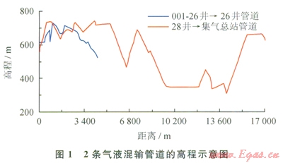 某高含硫氣田各生產(chǎn)井H2S含量的變化范圍為2.15%~2.65%,CO2含量的變化范圍為2.86%~4.03%。選取5個(gè)測(cè)試井段天然氣組分的平均含量作為原料氣干基組成數(shù)據(jù)(表1)。同時(shí)以該高含硫氣田001-26井®26井集氣站和28井®集氣總站這2條氣液混輸管道為例,并結(jié)合這2條管道的現(xiàn)場(chǎng)實(shí)際生產(chǎn)數(shù)據(jù),確定相應(yīng)管道清管工況建模參數(shù)如表2所示,2條管道高程如圖1所示。