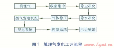 填埋場(chǎng)填埋氣發(fā)電原理是將固體廢棄物填埋場(chǎng)產(chǎn)生的填埋氣通過(guò)收集系統(tǒng)集中,再通過(guò)預(yù)處理裝置凈化(除塵、除水等)、穩(wěn)壓后送入燃?xì)獍l(fā)電機(jī)組,發(fā)電后通過(guò)配電系統(tǒng)、控制系統(tǒng),將發(fā)出的電能輸送到電網(wǎng)(填埋氣發(fā)電工藝流程見(jiàn)圖1)。