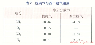 提純氣的調(diào)制要求是在滿(mǎn)足l2T天然氣的情況下與西二線氣滿(mǎn)足燃?xì)饣Q性的要求。經(jīng)計(jì)算,當(dāng)提純氣與西二線氣以體積比為1:1.5摻混時(shí),調(diào)制氣高華白數(shù)為47.1MJ/m3,燃燒勢(shì)為37.36,滿(mǎn)足12T天然氣標(biāo)準(zhǔn)。