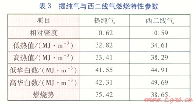 提純氣與西二線氣組成見(jiàn)表2,提純氣與西二線氣燃燒特性參數(shù)見(jiàn)表3。