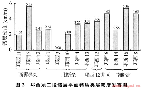 根據(jù)上述鈣質(zhì)砂巖測井曲線特征,對區(qū)內(nèi)13口井進(jìn)行了鈣質(zhì)夾層解釋和分布特征研究。研究結(jié)果表明:平面上,除邛西3井外,各井均發(fā)育一定數(shù)量的鈣質(zhì)砂巖層,其中以邛西5井、邛西16井鈣質(zhì)砂巖層發(fā)育密度最大,其次為邛西6和邛西8井(圖2)。