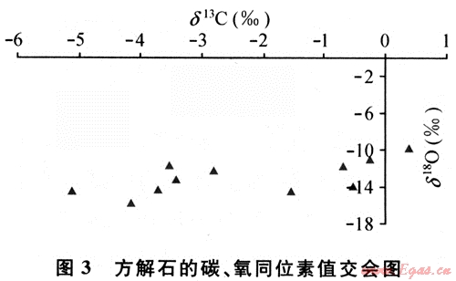 無論是不穩(wěn)定組分的溶解和交代作用還是碳酸鹽膠結(jié)作用,都與酸性水有關(guān),同時(shí)還需要孔隙水的不斷滲流和交替,否則溶解和膠結(jié)作用將很快達(dá)到相對平衡狀態(tài)而停止。儲層砂巖中鈣質(zhì)膠結(jié)物δ18O值為-9.8‰~-15.97‰,平均為-13.09‰;δ13C值為-5.11‰~0.41‰,平均為-2.29‰。碳酸鹽膠結(jié)物的碳、氧同位素總體上表現(xiàn)為正相關(guān)性(圖3),折算溫度為105~135℃[4]。根據(jù)碳同位素特征表明,該區(qū)碳同位素值偏負(fù),與有機(jī)質(zhì)排烴時(shí)生成的有機(jī)酸有關(guān)[5~6],其反應(yīng)方程為: