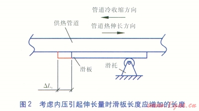 由以上分析計(jì)算可知,僅考慮升溫引起的管道熱伸長(zhǎng)量與綜合考慮升溫引起的管道熱伸長(zhǎng)量以及內(nèi)壓引起的管道伸長(zhǎng)量相比,絕對(duì)誤差為-112mm,相對(duì)誤差為-11.8%。若不考慮內(nèi)壓引起的管道伸長(zhǎng)量,易導(dǎo)致滑板長(zhǎng)度設(shè)置不合理,從而引起滑板脫離滑托。