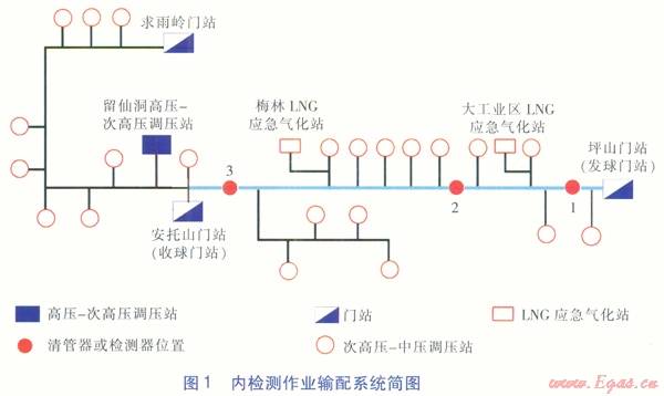 調(diào)度中心收集、匯總現(xiàn)場信息,計算分析清管器或檢測器實時速度,調(diào)整供氣門站、LNG應(yīng)急氣化站的流量,有效控制球速,滿足內(nèi)檢測作業(yè)的工藝要求。預(yù)測清管器或檢測器通過各分輸支線及收球門站的時間,提前通知廠站現(xiàn)場指揮組做好相應(yīng)操作準(zhǔn)備。通過調(diào)整清管器或檢測器的發(fā)球時間和速度,避免在供氣高峰時段關(guān)停重要的調(diào)壓站而影響下游供氣。在清管器或檢測器卡堵的應(yīng)急情況下,進行管網(wǎng)運行工況調(diào)整及供氣保障的氣量調(diào)度。