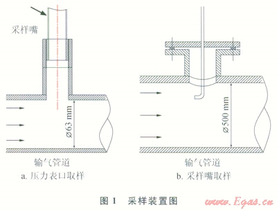 井口管道的直徑為63mm,站內(nèi)匯管管徑為500mm??紤]到站內(nèi)實際情況,井口的取樣位置選擇在流量計前的短接處,更換為專門加工帶有采樣孔的短接[7];站內(nèi)匯管取樣位置首選能夠插入采樣嘴的位置,若無此類位置供選擇,就選擇壓力表口進(jìn)行取樣[8]。采樣裝置如圖1所示。