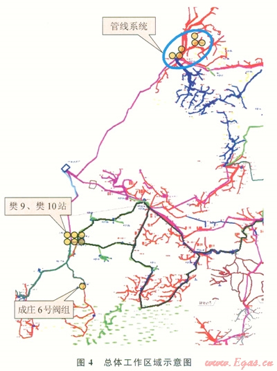 區(qū)塊內(nèi)小型管線系統(tǒng)如圖5所示,共5個測試點(以黃色圓形表示):華固18-2井(單井產(chǎn)氣量為516m3/d)、華固18-3井(單井產(chǎn)氣量為2774m3/d)、樊4集氣站的18號閥組采氣干線、樊4站進(jìn)口匯管、樊4站出口。