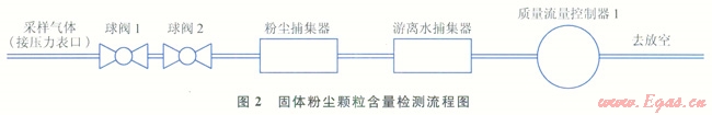 2)測試流程設(shè)計。采用濾筒捕集稱重方法獲得固體粉塵平均濃度,采用在線檢測方法得到氣質(zhì)粉塵動態(tài)變化和粒徑分布,采用在線水露點儀和分子篩吸附等方法計算出水蒸氣含量和游離水含量,分析得知粉塵成分的基本組成,計算出固體粉塵顆粒物的平均分子量和密度,便于數(shù)據(jù)處理。同時,檢測工作也存在一定的局限性:難以得到較高濃度固體粉塵含量的精確值,不能通過在線捕集方法在一個測試周期內(nèi)得到固體粉塵顆粒成分所需的樣品量等。