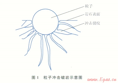 1)高速的粒子沖擊到巖石的表面后,接觸應力繼續(xù)增加時,會在接觸面附近的巖石內(nèi)部產(chǎn)生剪切應力和拉伸應力,當粒子沖擊產(chǎn)生的拉應力和剪應力大于巖石的抗拉和抗剪強度后,破碎的裂紋開始產(chǎn)生。粒子以100m/s以上的速度沖擊巖石,粒子含量為2%時,粒子沖擊的頻率每分鐘達500萬次。